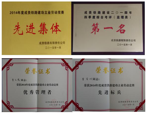 公司成貴監(jiān)理項(xiàng)目部在業(yè)主(成貴鐵路有限責(zé)任公司)組織的2014年度建功立業(yè)勞動(dòng)競(jìng)賽評(píng)比活動(dòng)中獲得先進(jìn)集體榮譽(yù),李文俊、李宗付同志喜獲優(yōu)秀管理者、先進(jìn)標(biāo)兵稱號(hào)。